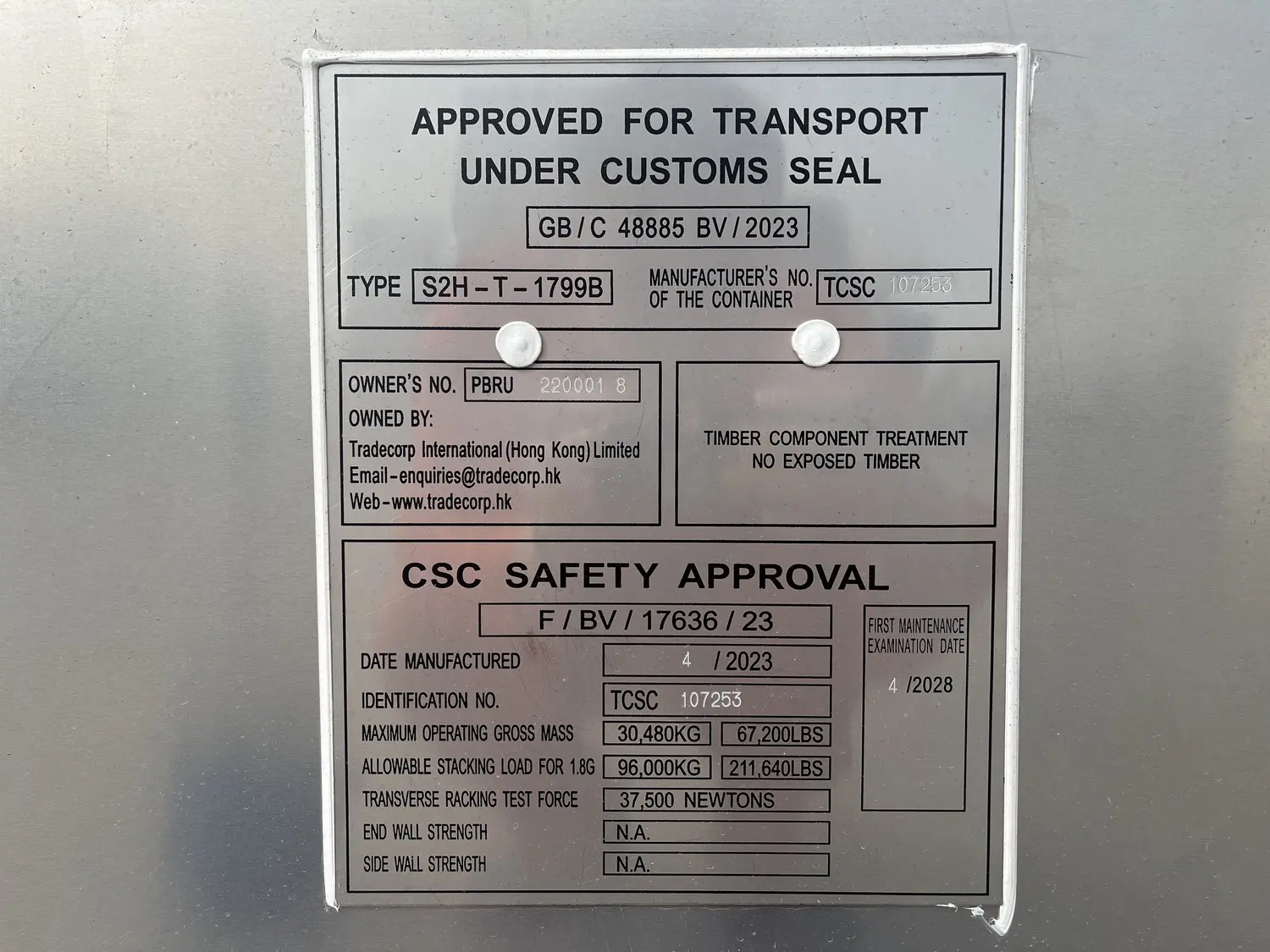 - CSC Plate (Optional): May include a CSC plate, indicating that it meets international shipping standards.